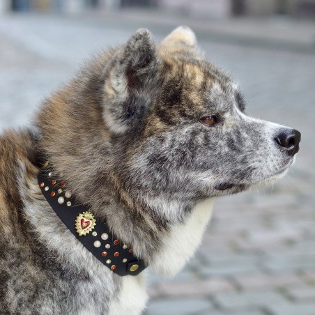 Votre chien mérite un accessoire de luxe aussi stylé que lui, et ce collier en Biothane noir, orné de strass noirs et blancs, est la touche parfaite pour un look à la fois chic et mystérieux. Son détail phare ? Un sublime ex-voto en forme de cœur en son centre, qui ajoute une dimension sacrée et unique à ce bijou canin.