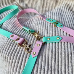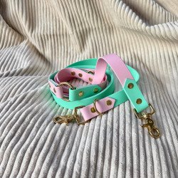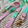 Laisse Bicolore Trois Points en Biothane, de couleur Rose et Vert Caraïbes avec bouclerie dorée et médaillon Inugami.