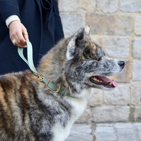 Gardez votre chien à proximité avec cette poignée en Biothane vert brouillard, résistante, imperméable et facile à attacher au harnais ou au collier.